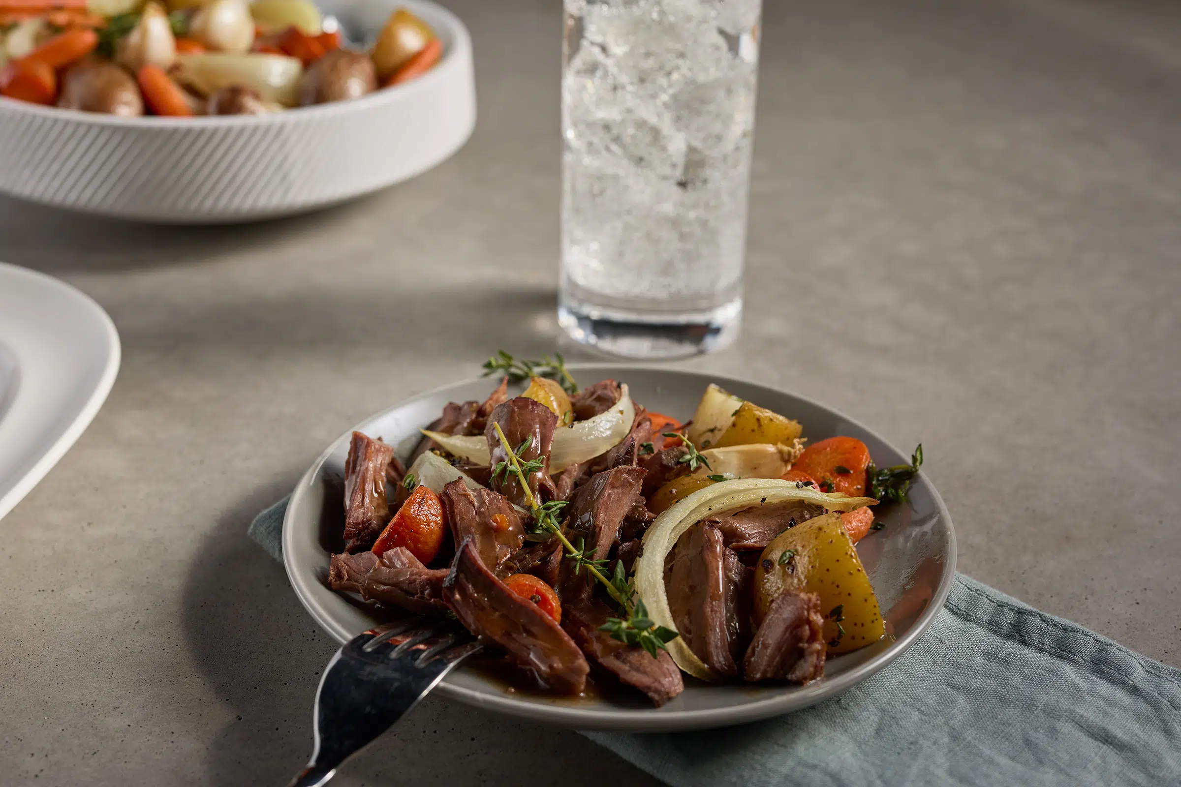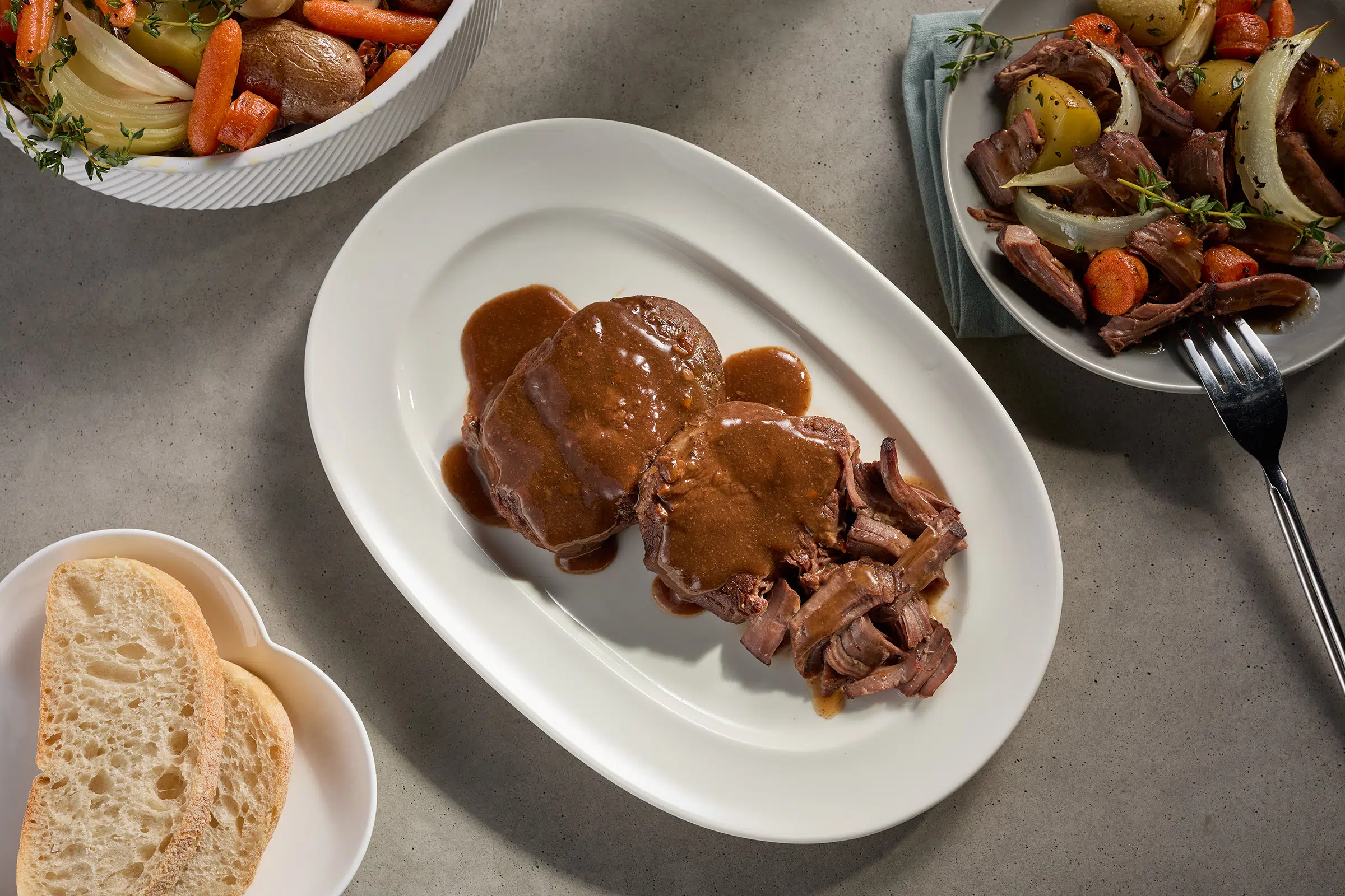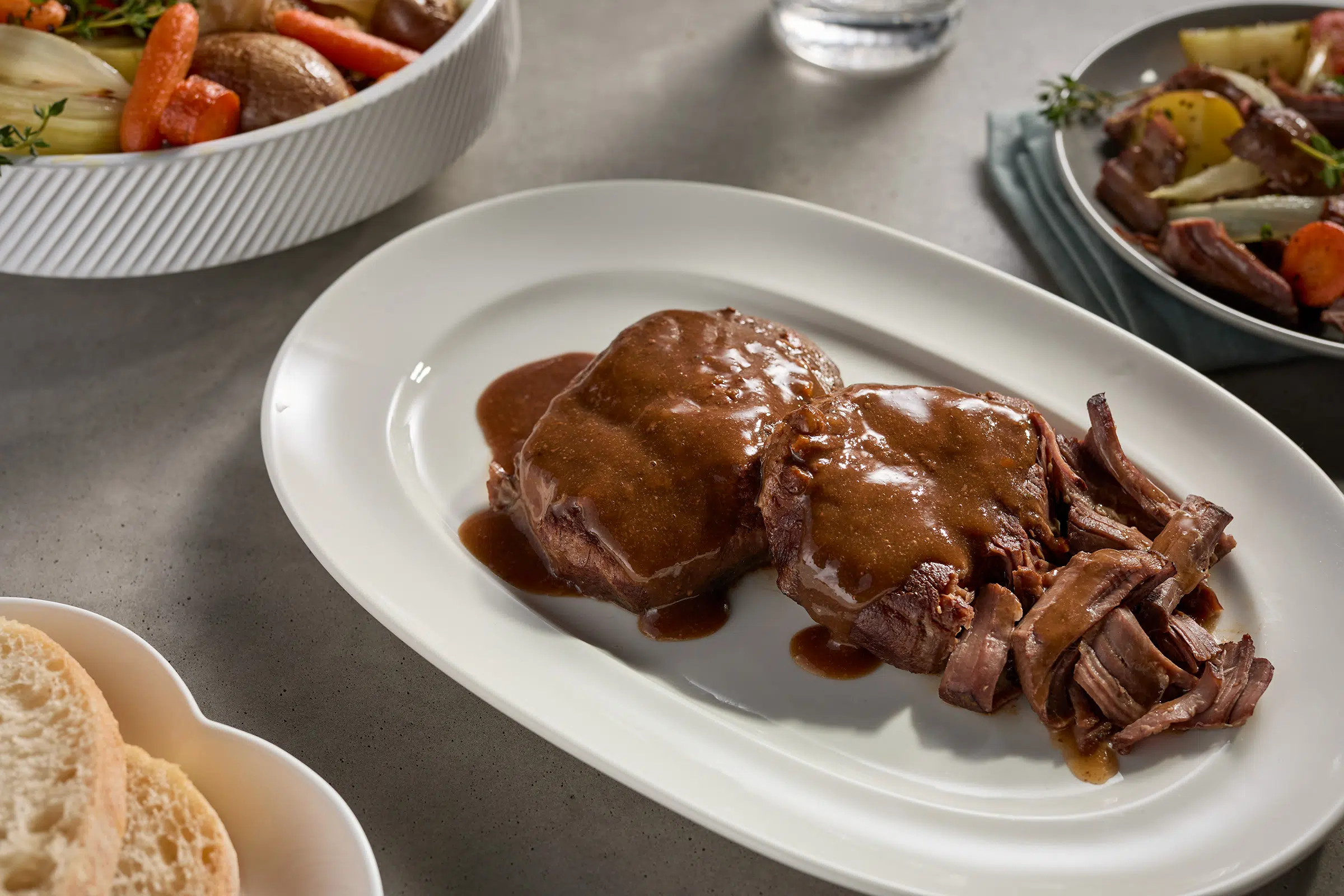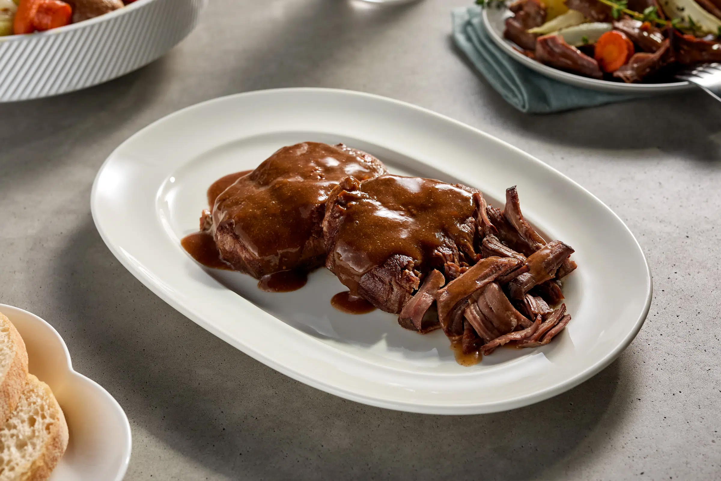 Preheat the oven to 325°F (165°C). Remove from packaging and place it in an oven-safe dish and cover with foil or a lid. Warm for 25-45 minutes, basting occasionally if desired. Remove from the oven when the internal temp reaches 165°F and meat is at desired tenderness. Let stand for a few minutes before serving. Enjoy!