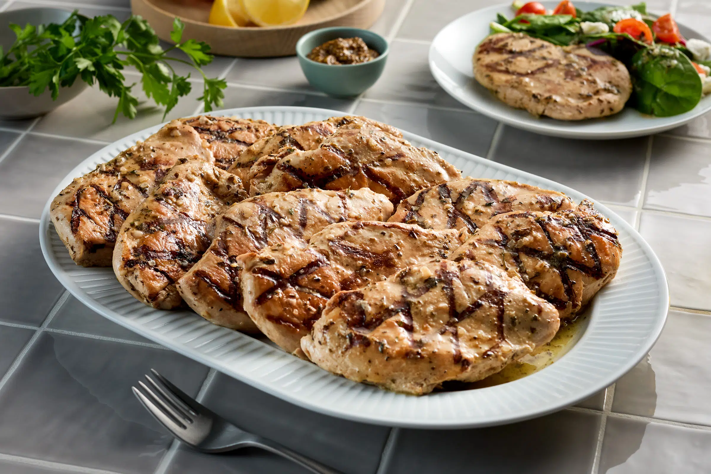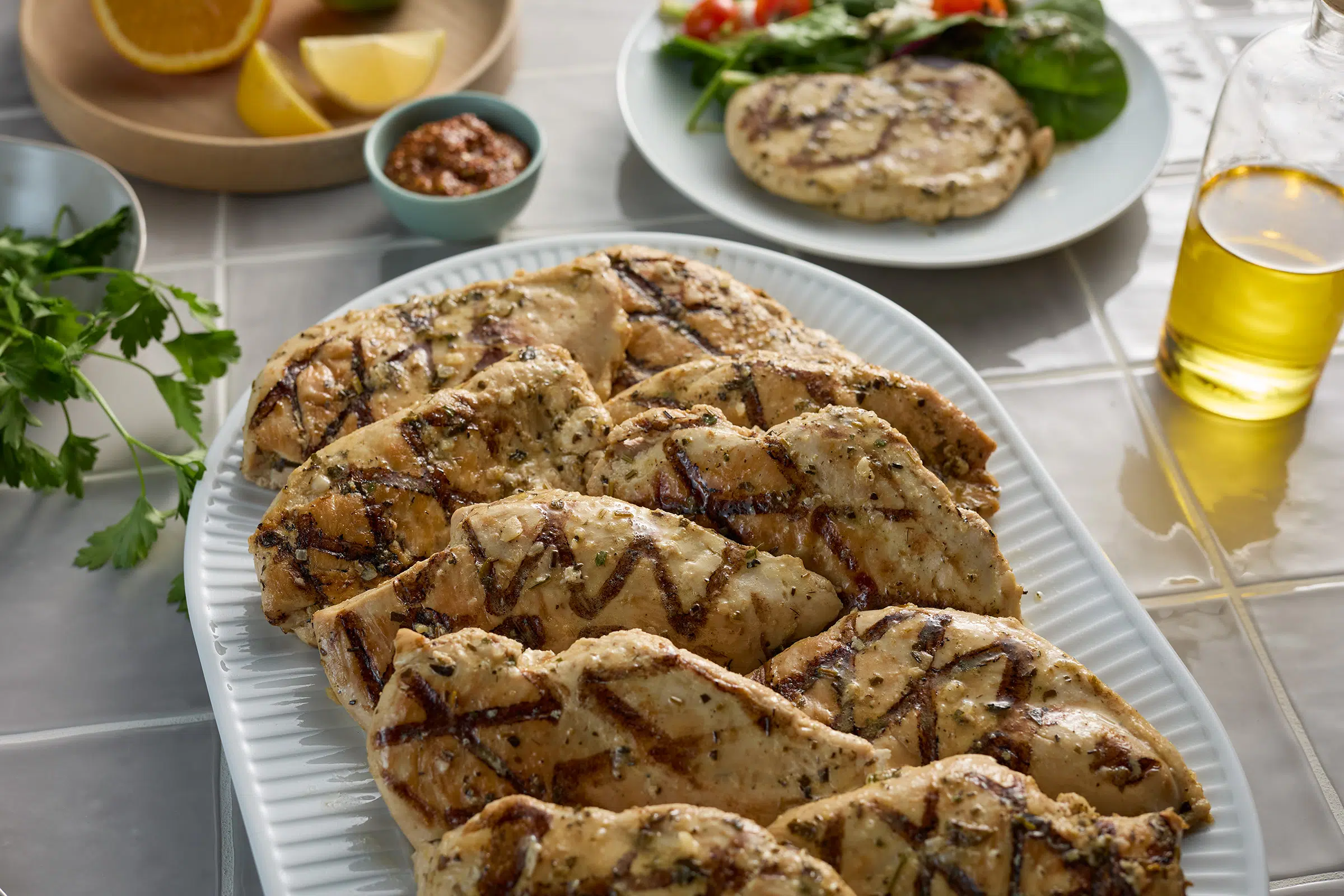 COOKED CHICKEN BREAST WITH RIB MEAT, WATER, CANOLA OIL, EXTRA VIRGIN OLIVE OIL, ORANGE PUREE (CONCENTRATED ORANGE JUICE, WATER, CONCENTRATED TANGERINE JUICE, ORANGE PULP CELLS, WHOLE GROUND ORANGES AND ORANGE OIL), CONTAINS LESS THAN 2% OF CHICKEN BASE MARINADE (SALT, DEHYDRATED CHICKEN BROTH, RICE STARCH, YEAST EXTRACT, SAFFLOWER OIL, NATURAL FLAVORS, RENDERED CHICKEN FAT, SOYBEAN OIL, CANOLA OIL, EXTRACTIVE OF CARROT [COLOR]), SPICES, DIJON MUSTARD (DISTILLED VINEGAR, WATER, MUSTARD SEED, SALT, WHITE WINE, CITRIC ACID, TARTARIC ACID, SPICES), GARLIC, LEMON JUICE, LIME JUICE, SALT, DRIED ONION, XANTHAN GUM.
