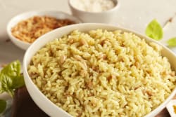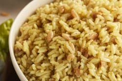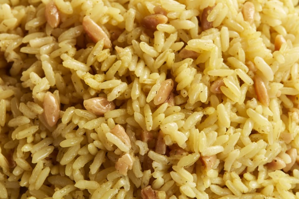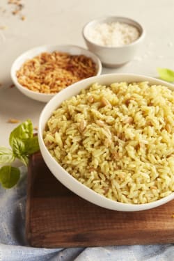 WATER, ENRICHED LONG GRAIN RICE (LONG GRAIN PARBOILED RICE, ENRICHED WITH IRON [FERRIC ORTHOPHOSPHATE], THIAMIN MONONITRATE, FOLIC ACID), ONIONS, OIL BLEND (CANOLA OIL, EXTRA VIRGIN OLIVE OIL), CHICKEN BASE (ROASTED CHICKEN, SALT, YEAST EXTRACT, NATURAL FLAVOR, TURMERIC), ORZO (ENRICHED MACARONI PRODUCT [SEMOLINA {WHEAT}, NIACIN, IRON {FERROUS SULFATE}, THIAMIN MONONITRATE, RIBOFLAVIN, FOLIC ACID]), CONTAINS LESS THAN 2% OF SALT, GRANULATED GARLIC, SPICES, TURMERIC.