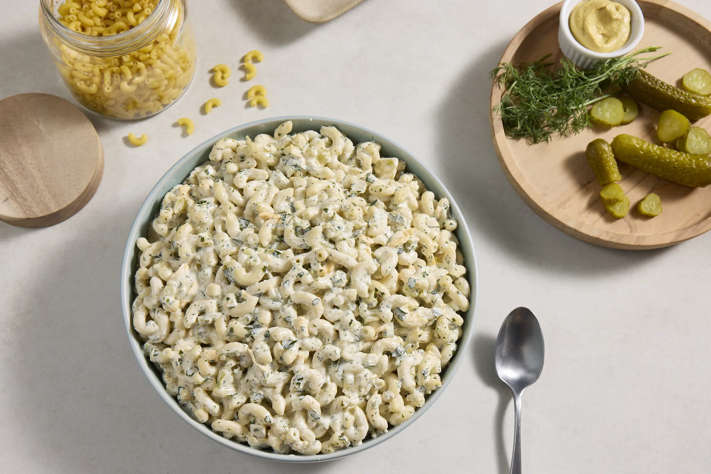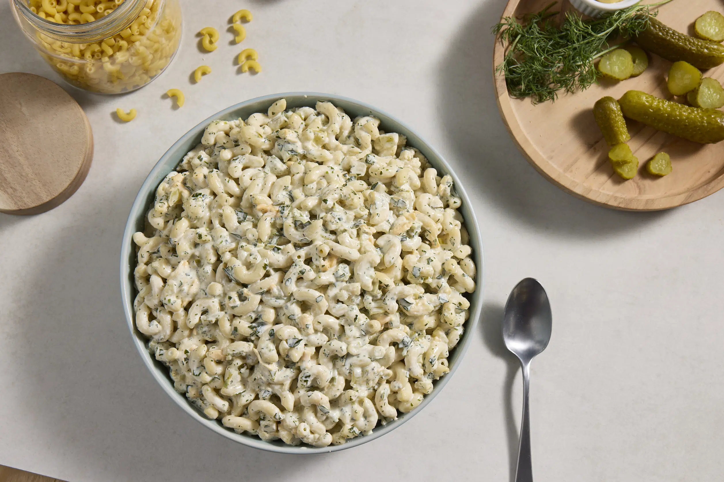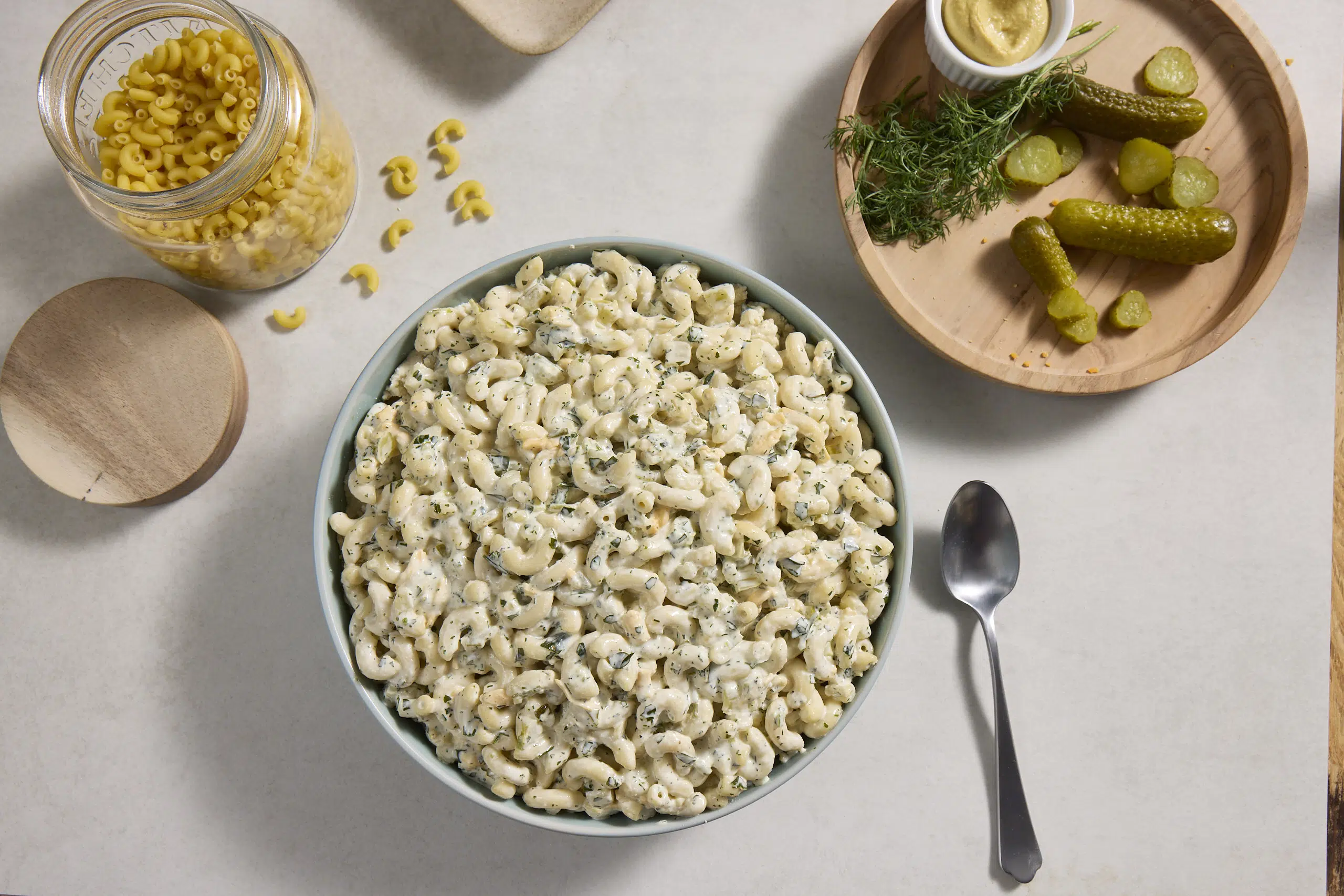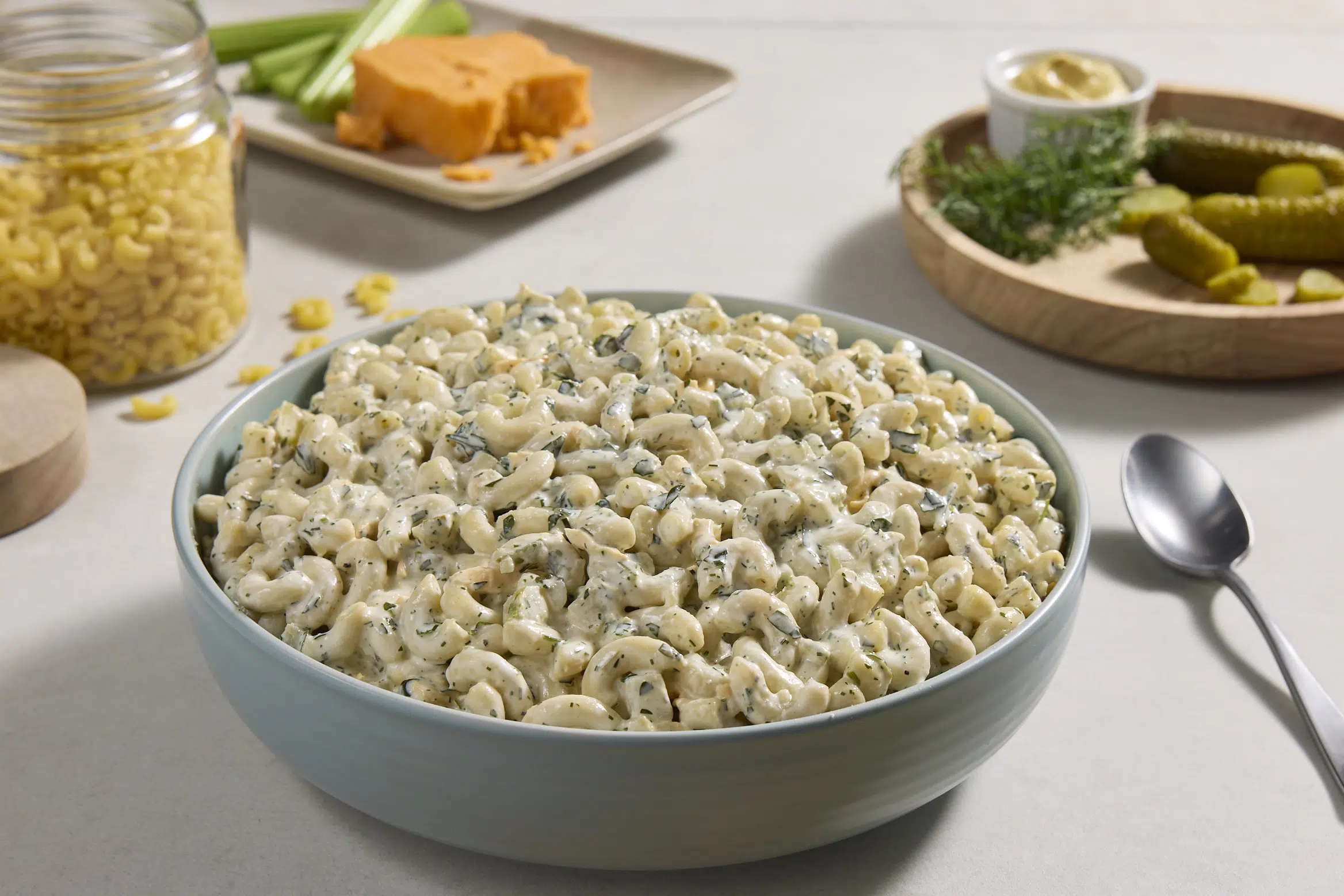 COOKED ENRICHED MACARONI PRODUCT (WATER, SEMOLINA [WHEAT], NIACIN, FERROUS SULFATE, THIAMIN MONONITRATE, RIBOFLAVIN, FOLIC ACID), DILL RELISH (PICKLES, WATER, DISTILLED VINEGAR, SALT, NATURAL FLAVORS, XANTHAN GUM), SOYBEAN OIL, CELERY, WATER, CHEDDAR CHEESE (MILK, CULTURE, SALT, ENZYMES, ANNATTO [COLOR], ANTI-CAKING BLEND [POTATO STARCH, POWDERED CELLULOSE]), CONTAINS LESS THAN 2% OF SPICES, DIJON MUSTARD (DISTILLED VINEGAR, WATER, MUSTARD SEED, SALT, WHITE WINE, CITRIC ACID, TARTARIC ACID, SPICES), EGGS, SALT, SAL TED EGG YOLKS, SUGAR, GRANULATED GARLIC, WHITE DISTILLED VINEGAR, POTASSIUM SORBATE (TO PREVENT SPOILAGE), LEMON JUICE CONCENTRATE, GUAR GUM, XANTHAN GUM, PAPRIKA (COLOR).
