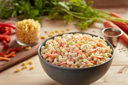 COOKED ENRICHED MACARONI PRODUCT (WATER, SEMOLINA [WHEAT], NIACIN, FERROUS SULFATE, THIAMIN MONONITRATE, RIBOFLAVIN, FOLIC ACID), HIGH FRUCTOSE CORN SYRUP, SOYBEAN OIL, WATER, CELERY, CONTAINS LESS THAN 2% OF EGGS, ONIONS, WHITE DISTILLED VINEGAR, MUSTARD (DISTILLED VINEGAR, MUSTARD SEED, SALT, TURMERIC, SPICES), RED BELL PEPPERS (RED BELL PEPPERS, WATER. CITRIC ACID), SALT, EGG YOLKS (EGG YOLKS, SALT), MUSTARD (WATER, DISTILLED VINEGAR, MUSTARD SEED, SALT, SPICES), MODIFIED CORN STARCH, POTASSIUM SORBATE (TO RETARD SPOILAGE), GUAR GUM, XANTHAN GUM, CALCIUM DISODIUM EDTA.