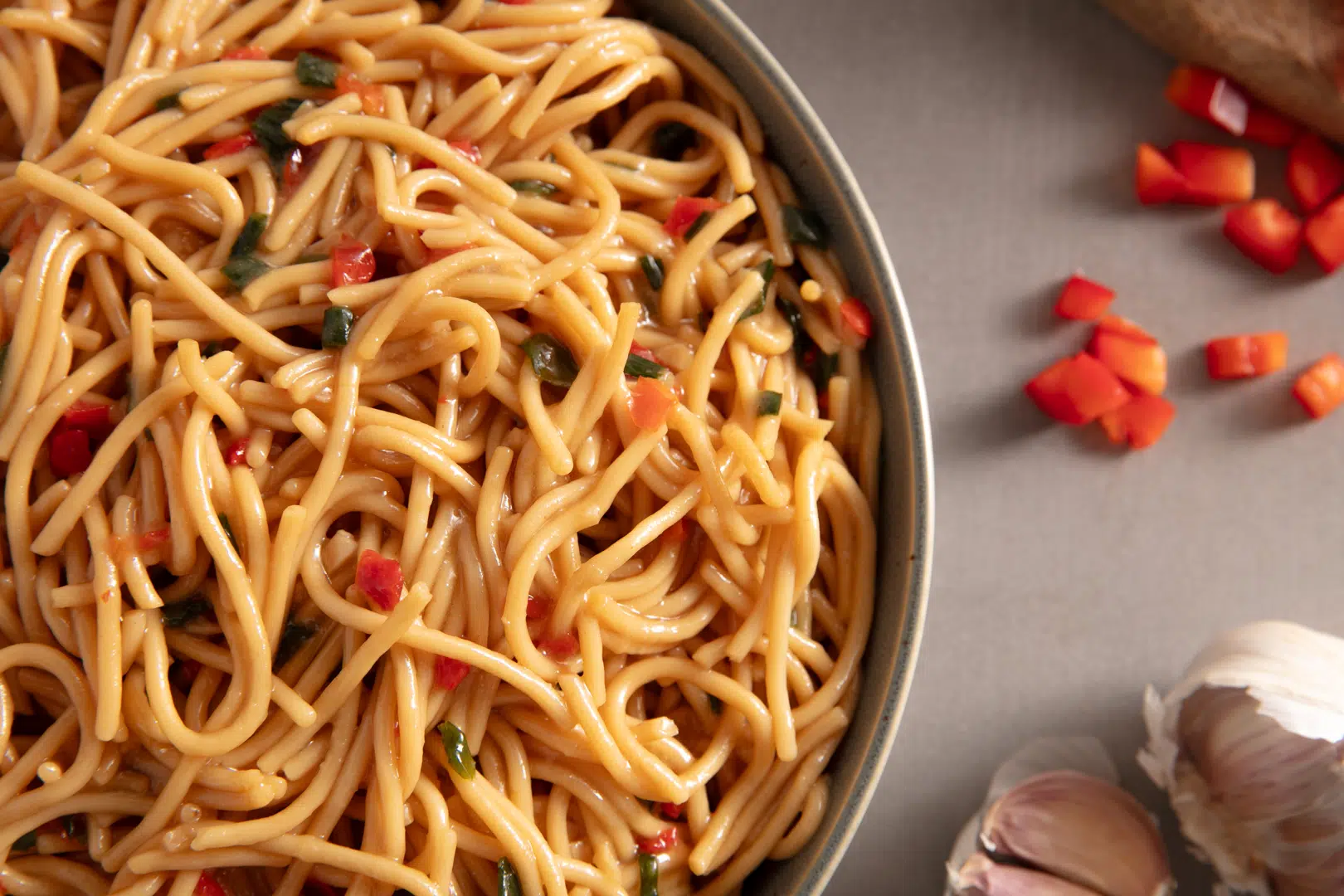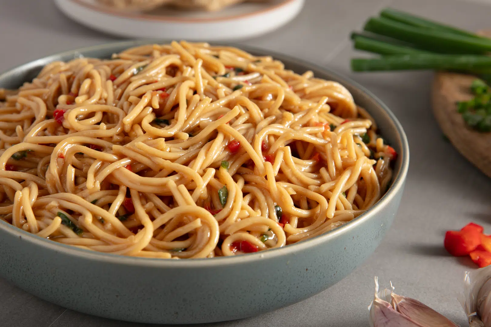 COOKED ENRICHED MACARONI PRODUCT (WATER, SEMOLINA [WHEAT], NIACIN, FERROUS SULFATE, THIAMIN MONONITRATE, RIBOFLAVIN, FOLIC ACID), RICE VINEGAR, SOY SAUCE (WATER, SOYBEANS, WHEAT, SALT), SOYBEAN OIL, RED BELL PEPPERS, SUGAR, GREEN ONIONS, CONTAINS LESS THAN 2% OF GARLIC, SESAME OIL, SPICES, POTASSIUM SORBATE (TO PREVENT SPOILAGE), XANTHAN GUM.