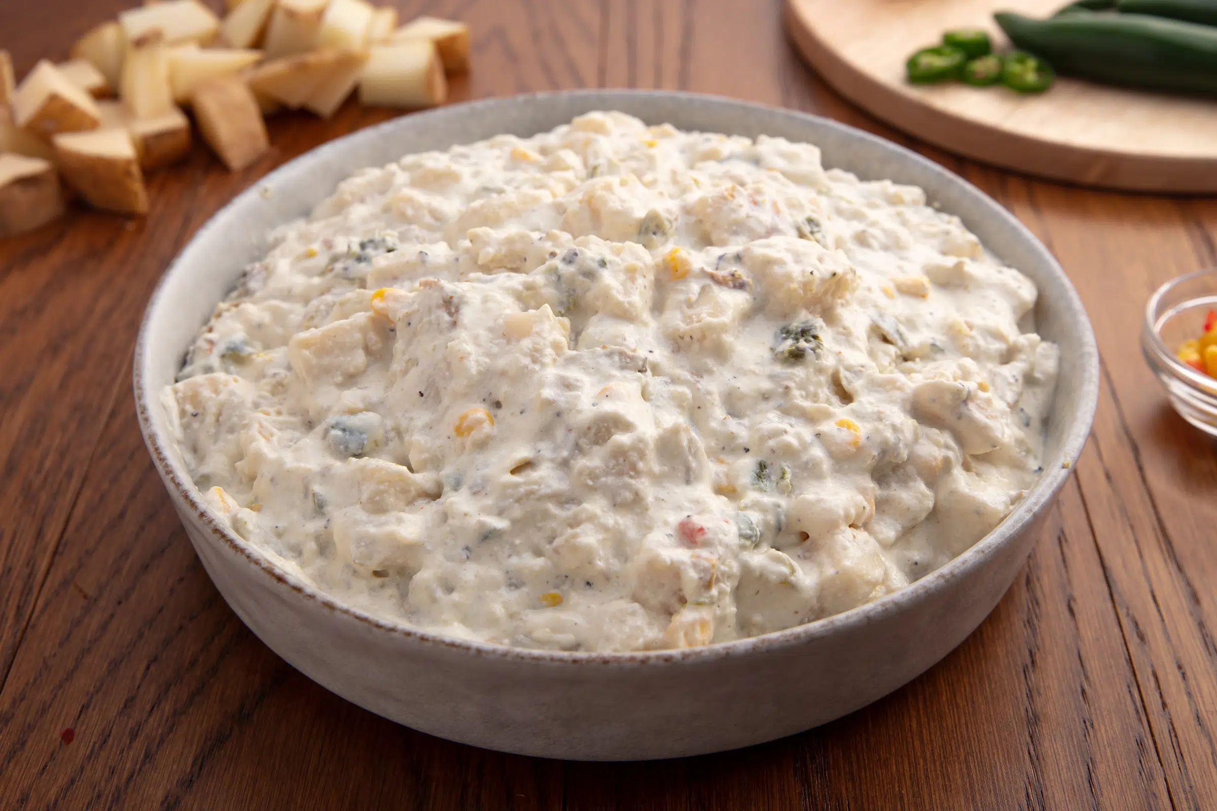 POTATOES, SOYBEAN OIL, WATER, CORN, ROASTED POBLANO PEPPERS, CHILE PEPPERS (GREEN CHILES, WATER, SALT, CITRIC ACID, CALCIUM CHLORIDE), SOUR CREAM (CULTURED MILK AND CREAM), CONTAINS LESS THAN 2% OF EGGS, SALT, GRANULATED GARLIC, GRANULATED ONION, SALTED EGG YOLKS, SUGAR, WHITE DISTILLED VINEGAR, CULTURED NONFAT DRY MILK POWDER, POTASSIUM SORBATE (TO PREVENT SPOILAGE), SPICES, HATCH CHILE POWDER, LEMON JUICE CONCENTRATE, XANTHAN GUM, PAPRIKA (COLOR).