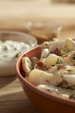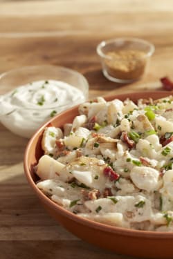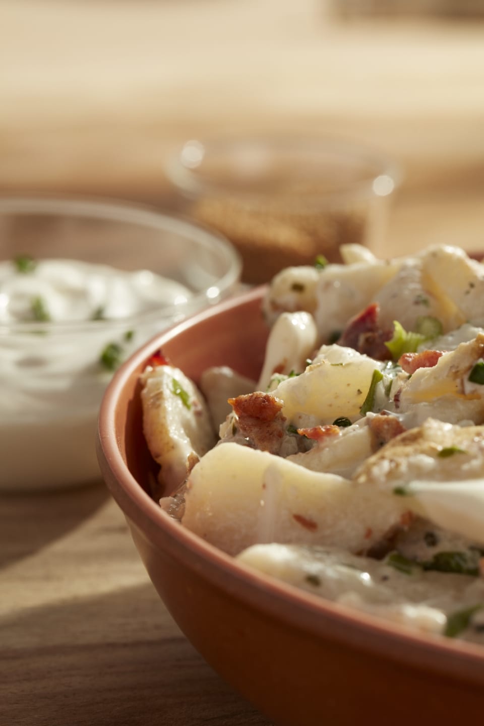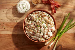 Tender potatoes tossed in a smoky, bacon infused sour cream dressing with fresh green onions and chives for color and brightness. A touch of mustard and vinegar rounds out the flavor crerating a remarkable side dish.