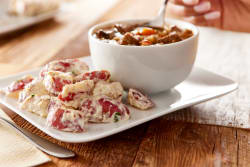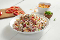 POTATOES, WATER, SOYBEAN OIL, SOUR CREAM (CULTURED MILK AND CREAM), CELERY, IMITATION CHEDDAR CHEESE (WATER, PALM OIL, CASEIN, MODIFIED POTATO STARCH, NON FAT DRY MILK, SALT, SODIUM PHOSPHATE, NATURAL FLAVOR, SODIUM ALUMINUM PHOSPHATE, LACTIC ACID, GUAR GUM, SORBIC ACID [PRESERVATIVE], APOCAROTENAL AND BETA CAROTENE [COLOR], POWDERED CELLULOSE [ANTICAKING]), EGGS, CONTAINS LESS THAN 2% OF FULLY COOKED BACON BITS WITH SMOKE FLAVOR ADDED (BACON BITS [CURED WITH WATER, SALT, SUGAR, SODIUM PHOSPHATES, SODIUM ERYTHORBATE, SODIUM NITRITE], SMOKE FLAVOR [MAY CONTAIN DEXTROSE, POTASSIUM CHLORIDE]), GREEN ONIONS, WHITE DISTILLED VINEGAR, GREEN BELL PEPPERS, RED ONIONS, SALT, GRANULATED ONION, BUTTERMILK SOLIDS, SUGAR, RED BELL PEPPERS, SALTED EGG YOLKS, POTASSIUM SORBATE (TO PREVENT SPOILAGE), GRANULATED GARLIC, XANTHAN GUM, SPICES, LEMON JUICE CONCENTRATE, PAPRIKA (COLOR).