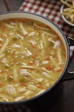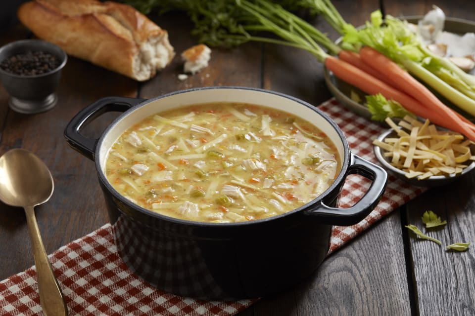 WATER, COOKED ENRICHED EGG NOODLES (WATER, SEMOLINA [WHEAT], EGGS, ENRICHED WITH NIACIN, IRON [FERROUS SULFATE], THIAMINE MONONITRATE, RIBOFLAVIN, FOLIC ACID), COOKED WHITE MEAT CHICKEN (COOKED WHITE MEAT CHICKEN, WATER, POTASSIUM LACTATE, SODIUM TRIPOLYPHOSPHATE, SALT), ONIONS, CARROTS, CELERY, CHICKEN BASE (CHICKEN MEAT INCLUDING NATURAL CHICKEN JUICES, SALT, HYDROLYZED SOY PROTEIN, NATURAL FLAVORINGS, SUGAR, POTATO FLOUR, TURMERIC [COLOR] AND CARROT POWDER), CONTAINS LESS THAN 2% OF BUTTER (PASTEURIZED CREAM, SALT), MODIFIED CORN STARCH, SUGAR, GRANULATED GARLIC, SPICES, XANTHAN GUM, LEMON JUICE CONCENTRATE.