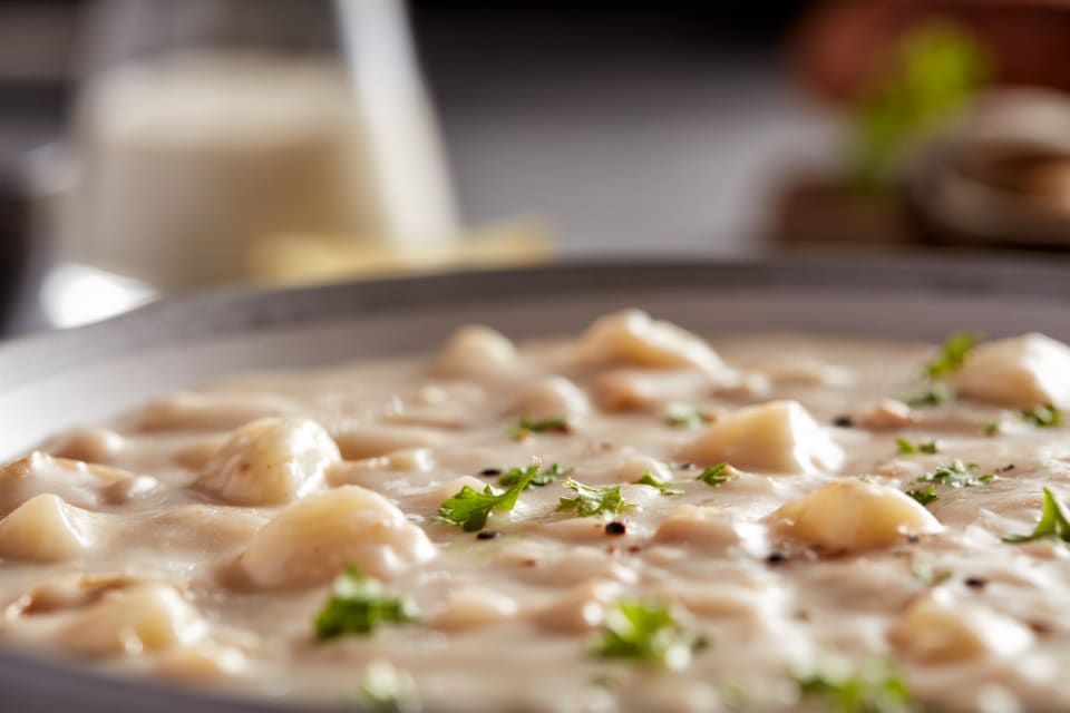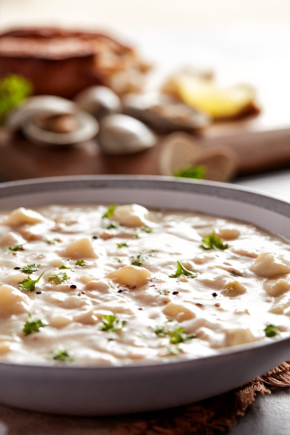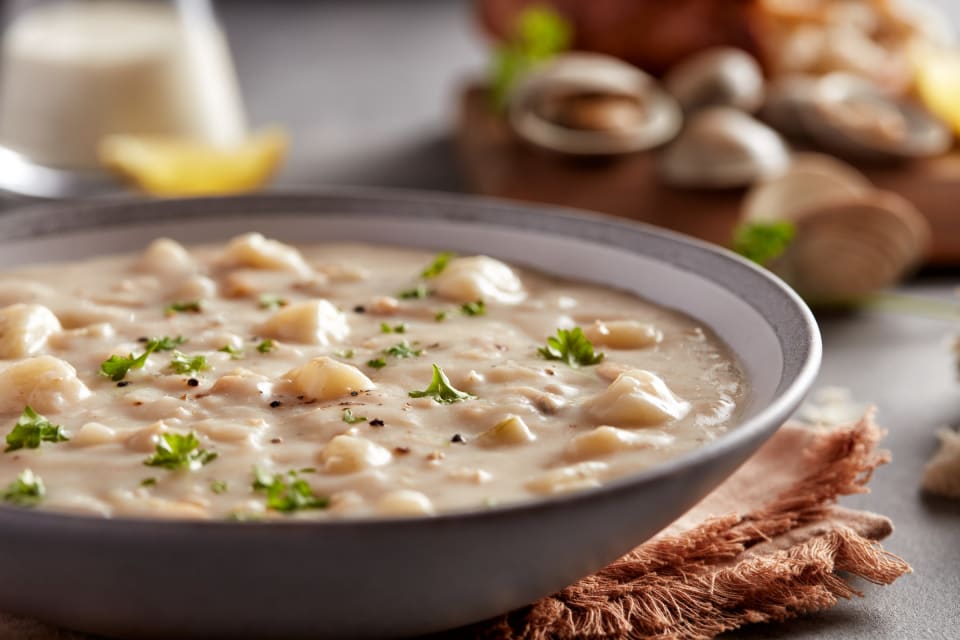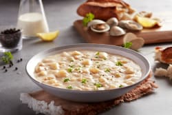 CHOPPED CLAMS (OCEAN CLAMS AND CLAM JUICE, SALT, SODIUM TRIPOLYPHOSPHATE [TO RETAIN NATURAL JUICES], CALCIUM DISODIUM EDTA [TO PRESERVE COLOR]), WHIPPING CREAM, WATER. POTATOES, ONIONS, CELERY, CONTAINS LESS THAN 2% OF LEEKS, MODIFIED CORN STARCH, CLAM BROTH (CLAM BROTH [DEHYDRATED), MALTODEXTRIN), SOYBEAN OIL, POTATO GRANULES (DRIED POTATO, MONOGLYCERIDE), RENDERED BACON FAT (CURED WITH WATER. SALT, SUGAR, SODIUM ERYTHORBATE, SODIUM NITRITE, SMOKE FLAVORING, DEXTROSE, BROWN SUGAR, SODIUM PHOSPHATE, POTASSIUM CHLORIDE, SODIUM DIACETATE, FLAVORING, HONEY, [TBHQ AND CITRIC ACID ADDED AS STABILIZERS]), NISIN PREPARATION (NISIN [PRESERVATIVE], SALT, ROSEMARY EXTRACT), SPICES. CONTAINS A BIOENGINEERED FOOD INGREDIENT