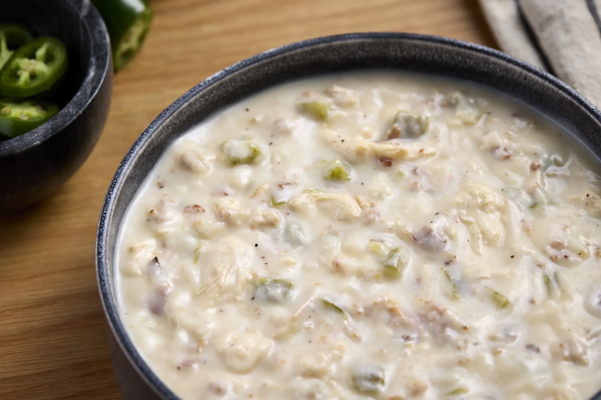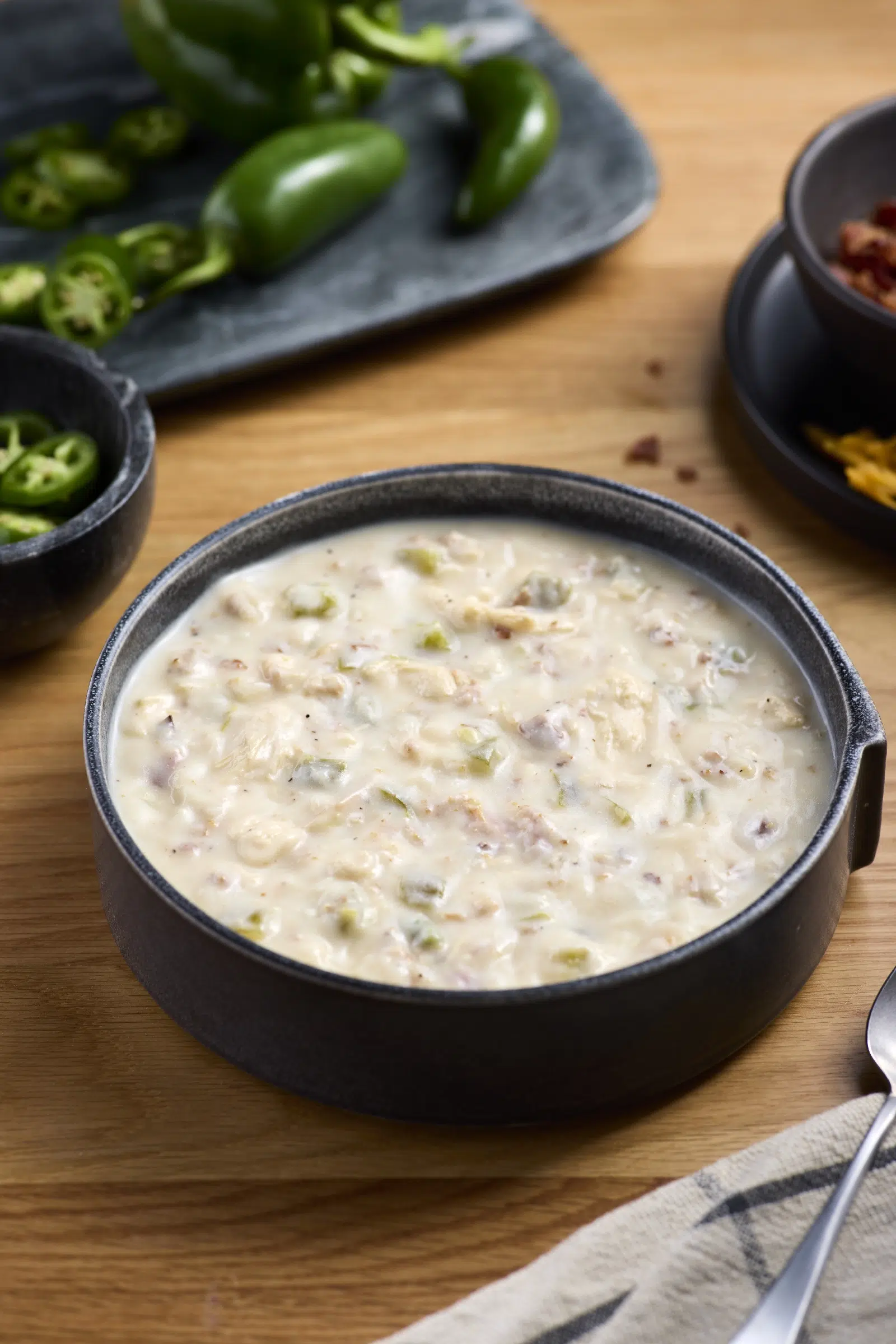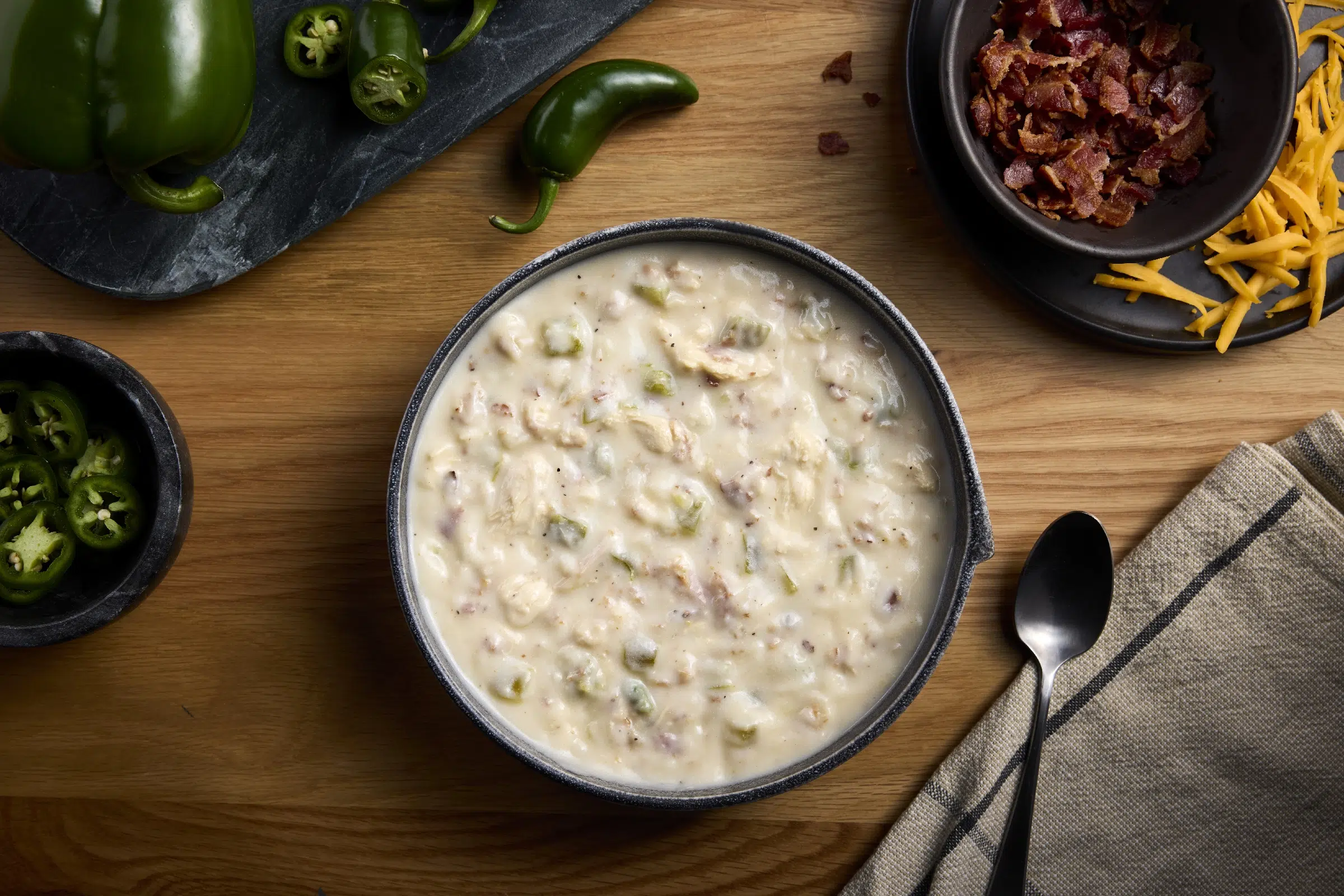 WATER, MILK (MILK, VITAMIN D3 ADDED), GREEN BELL PEPPERS, ONIONS, COOKED WHITE MEAT CHICKEN WITH RIB MEAT, CREAM CHEESE (CULTURED MILK AND CREAM, SALT, STABILIZERS [GUAR GUM, CAROB BEAN GUM]), FULLY COOKED BACON BITS WITH SMOKE FLAVOR ADDED (BACON BITS [CURED WITH WATER, SALT, SUGAR, SODIUM PHOSPHATES, SODIUM ERYTHORBATE, SODIUM NITRITE], SMOKE FLAVOR [MAY CONTAIN DEXTROSE, POTASSIUM CHLORIDE]), CHEDDAR CHEESE (MILK, CULTURE, SALT, ENZYMES, ANNATTO [COLOR], ANTI-CAKING BLEND [POTATO STARCH, POWDERED CELLULOSE]), MODIFIED CORN STARCH, CONTAINS LESS THAN 2% OF JALAPENO PEPPERS, GARLIC, CHICKEN BASE (ROASTED CHICKEN, SALT, YEAST EXTRACT, NATURAL FLAVOR, TURMERIC), SALT, RENDERED BACON FAT (CURED WITH WATER, SALT, SUGAR, SODIUM ERYTHORBATE, SODIUM NITRITE, SMOKE FLAVORING, DEXTROSE, BROWN SUGAR, SODIUM PHOSPHATE, POTASSIUM CHLORIDE, SODIUM DIACETATE, FLAVORING, HONEY, [TBHQ AND CITRIC ACID ADDED AS STABILIZERS]), SODIUM CITRATE, SPICES, NISIN PREPARATION (SALT, NISIN [PRESERVATIVE]) .