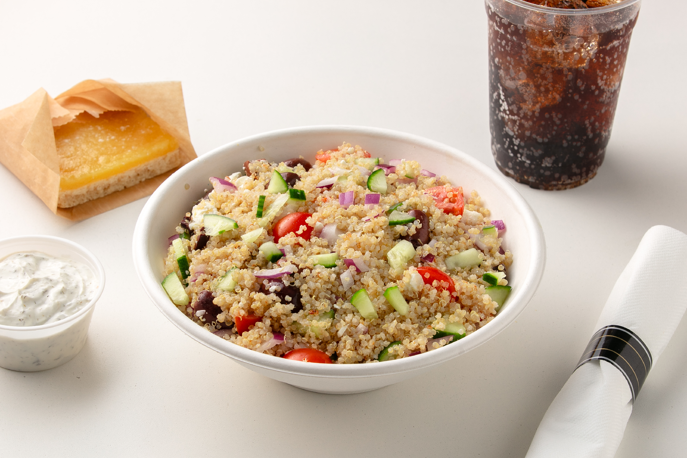 This Greek Quinoa Bowl features our Fully Cooked Quinoa topped with feta cheese, olives, and crisp vegetables like red onion, cucumber, and tomatoes. Finished with a classic Tzatziki sauce, this bowl is a quick, healthy, and delicious meal.