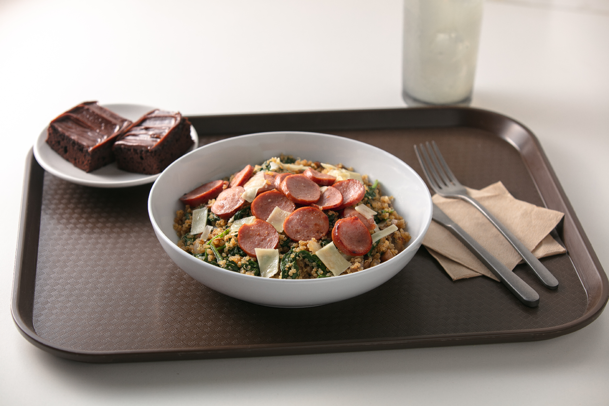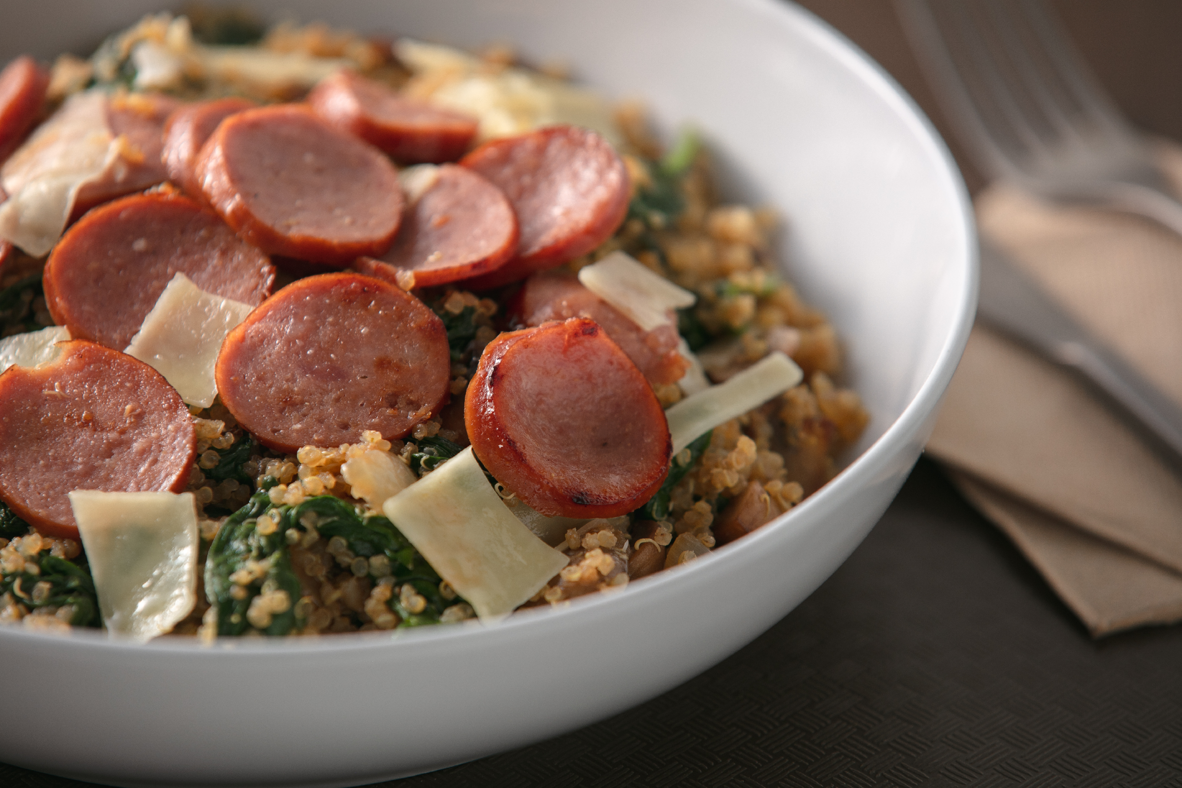 Our Fully Cooked Quinoa provides a light and fluffy base, perfectly complementing the rich flavors of sautéed mushrooms, tender spinach, and savory kielbasa sausage. With a hint of garlic and a sprinkle of Parmesan cheese, this dish is a quick and delicious solution for a satisfying made-to-order lunch or a weeknight dinner.
