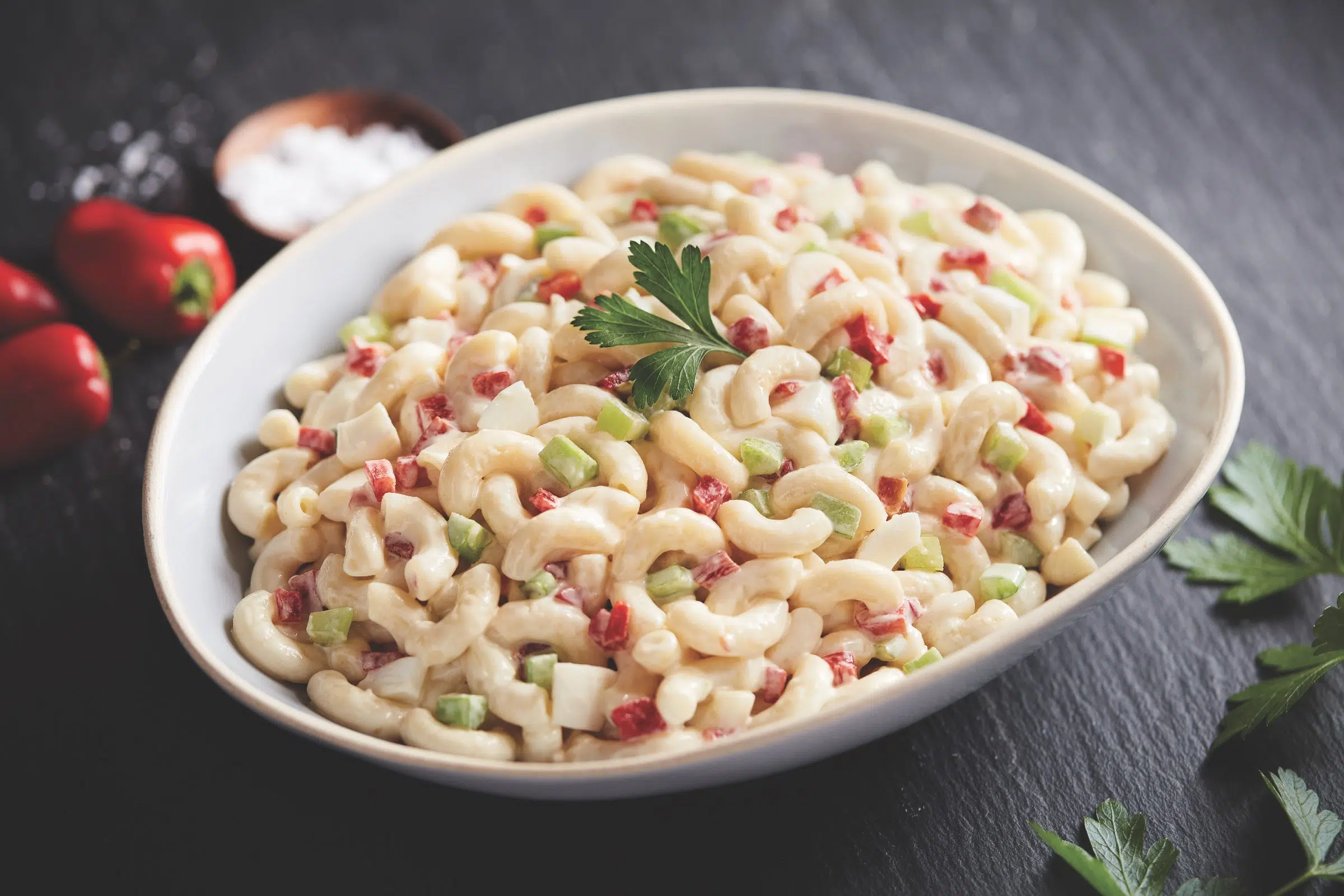 This classic macaroni salad is made with al dente noodles, a creamy, seasoned mayonnaise dressing, and fresh crunch from celery and red bell peppers. It’s a crowd-pleaser that’s perfect for sides, salads, and sandwiches.