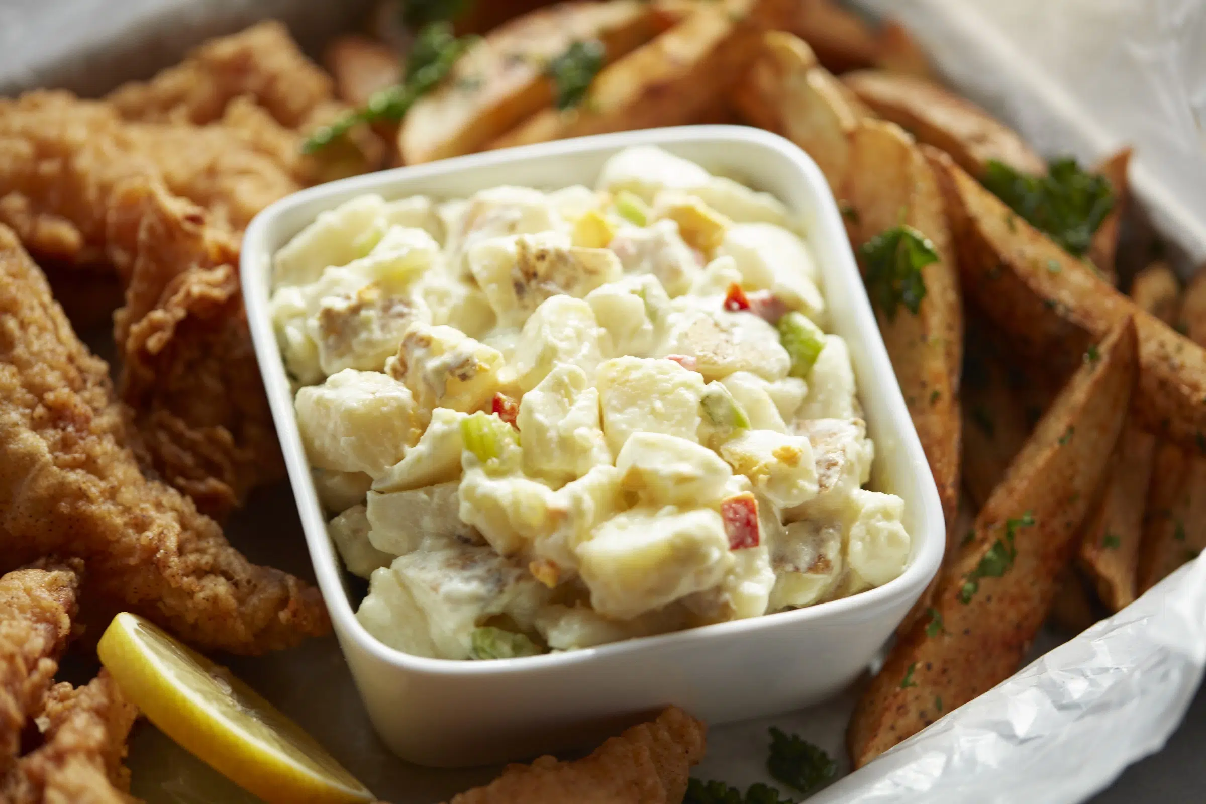 Our creamy, tangy potato salad is made with tender potatoes, eggs, and mustard for flavor that’s perfect for sandwiches, salads, or as a side dish – it’s a versatile, classic option for any menu.